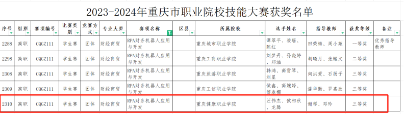 近日,在重庆城市职业公司举行了2023-2024年重庆市职业院校技能大赛,在RPA财务机器人应用与开发赛项中,公司3名大数据与财务管理专业员工积极准备,经过激烈角逐,获得市级三等奖的佳绩。(指导教师:谢琴、邓玲)